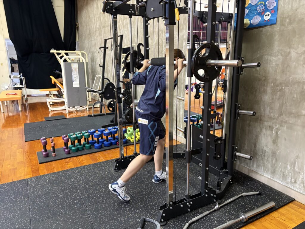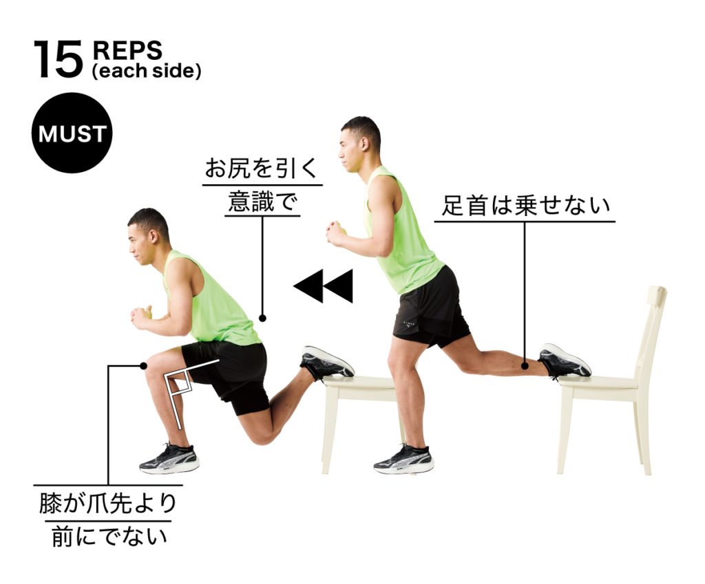 その為に、まずは椅子に足をかけた状態でのブルガリアンスクワットから行いました。